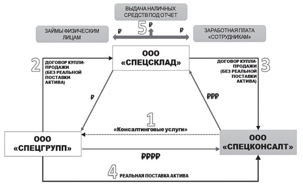 Юридические лица ООО «Спецгрупп», ООО «Спецсклад» и ООО «Спецконсалт» являются аффилированными. ООО «Спецгрупп» заключает договор на оказание консалтинговых услуг с ООО «Спецконсалт» и перечисляет денежные средства за оказанные услуги, что подтверждается актом об оказании услуг, при этом проверить реальность указанных услуг не представляется возможным. ООО «Спецгрупп» заключает договор купли-продажи оборудования (без которого у продавца невозможна основная деятельность) с ООО «Спецсклад», у которого отсутствуют складские помещения, на которые оно может принять поступившее оборудование. Денежные средства перечисляются за поставку товаров в адрес ООО «Спецгрупп», причем в сумме, гораздо ниже рыночной. При этом поставка ООО «Спецсклад» фактически не осуществляется. ООО «Спецсклад» заключает договор купли-продажи в отношении того же оборудования ООО «Спецконсалт» по цене гораздо выше рыночной, а фактически товары передаются напрямую ООО «Спецконсалт». По итогам реализации данной схемы, лицо, осуществляющее преднамеренное банкротство, получило возможность вывода наличных денежных средств из ООО «Спецсклад» путем перечисления заработной платы на расчетные счета сотрудников, которые числятся номинально, выдачи займов физическим лицам, а также выдачей наличных денежных средств под отчет. При этом поставленные товары (активы) остались на балансе юридического лица ООО «Спецконсалт», которое не обременено долговыми обязательствами.
