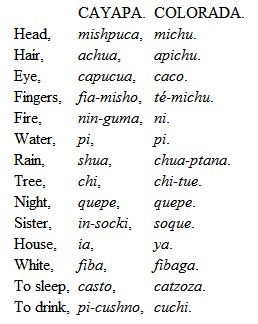 To the south of the Telembis and adjoining the Kechua-speaking Malabas in the district of La Tola were the Cayapas, of whom some remnants remain, still preserving their native tongue. A vocabulary of it, obtained by H. Wilcszynski, has recently been published.265 On comparing it with the Colorado vocabulary secured by Bishop Thiel and edited by Dr. Seler, it is clear that they are dialects of the same stock, as will be seen from these examples:266