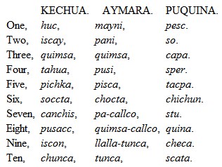 In these lists the Aymara numerals, one, two and four are independent; three, five, six and ten are taken from the Kechua; and the remaining three are compound, pa-callco, being 2+5; quimsa-callco, 3+5; and llalla-tunca meaning “less than ten.” Callco is derived from the word for “foot,” the counting being with the toes. On the other hand, there is not a single numeral in the Puquina which can be derived from either Kechua or Aymara; and what is more remarkable, there is apparently not one which is compounded.