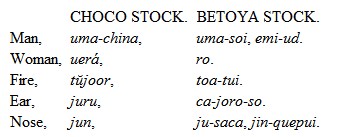 The Betoya has impressed me as showing some distant affinity to the Choco stock, and it may be that ampler resources on both sides would lead to the establishment of an original identity. The following words from the very scanty number which I have for comparison are noteworthy:
