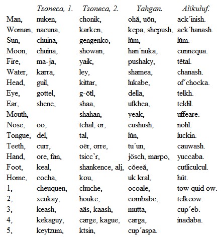 The Yahgan and Alikuluf pass for independent stocks. Yet in a number of words they resemble each other, and in a few, for example, those for “eye,” “woman,” “moon,” “man,” there seems more than a chance similarity.