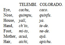The terminal syllable to in the Telembi words for hand and foot appears to be the Colorado té, branch, which is also found in the Col. té-michu, finger, te-chili, arm ornament, and again in the Telembi t’raill, arm.