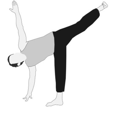 Секреты: голову поднять, взгляд вперед, перед собой; распределить вес тела между опорной стопой и ладонью, пятку опорной стопы развернуть слегка внутрь. Ногой тянем руку назад, вверх. Прогиб в груди.