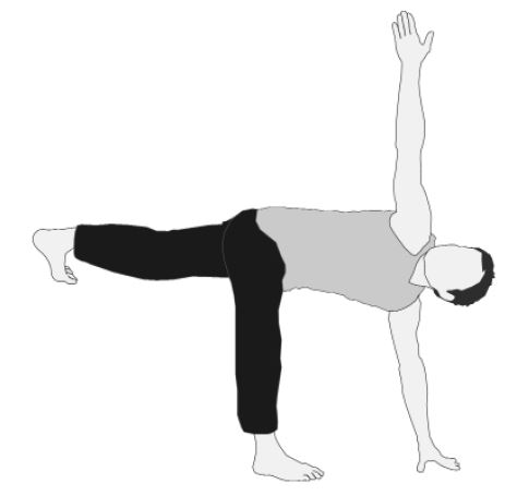 Исходное положение – стоя, ноги прямые. Делаем широкий шаг вперед правой ногой, затем наклоняемся вперед, прямую правую руку опускаем на пол перед стопой. А левую прямую ногу поднимаем и вытягиваем назад. Корпус прямой. Разворачивая левое плечо назад, прямую левую руку поднимаем вверх на уровне плеча. Плечи должны быть на одной линии, корпус прямой. Руки на одной линии с плечами. Ноги прямые. Взгляд вверх, в сторону вытянутой руки (РИС. 28). Если сложно держать баланс, то взгляд направляем в пол. Так же повторяем на другую сторону.