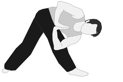 Стоя в Уттхита Триконасане с правой ногой впереди, правая рука за стопой на полу, сгибаем правое колено и правую руку заводим под бедро, изнутри правой ноги, сгибаем руку в локте и заводим за бедро снаружи. Левую руку заводим за спину, пальцы рук захватываем в замок. Разгибаем правую ногу, накручиваемся спиной на бедро правой ноги. Руки в замке, ноги прямые (РИС. 31). Так же и на другую сторону.