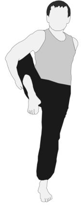 Стоя на прямых ногах, сгибаем правую ногу, берем двумя руками согнутую ногу и подтягиваем колено правой ноги к животу. Опора на прямую левую ногу. Держим баланс на левой ноге. Перехватываем стопу правой ноги руками, разгибаем правую ногу и поднимаем ногу как можно выше, ближе к голове. Ноги прямые, спина прямая (РИС. 39).