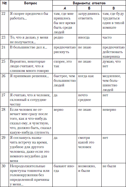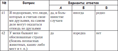 Инструкция. Перед тобой 42 вопроса и по три варианта ответа на каждый из них: «А», «Б» или «В». Отвечая на каждый вопрос, выбери один из этих вариантов – тот, который в большей степени соответствует твоим представлениям о себе. Старайся как можно реже прибегать к промежуточному, неопределенному варианту «Б». Помни, что здесь нет и не может быть правильных или неправильных ответов: все люди разные, и каждый может высказать индивидуальное мнение. Отвечай искренне и точно, не обдумывая долго варианты ответов. Отмечай тот ответ, который первым приходит в голову.