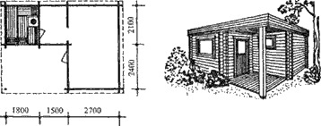 Рис. 59. Фасад и план сауны на 3 человека с предбанником и открытым крыльцом.