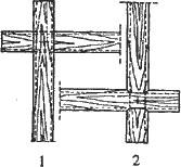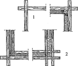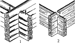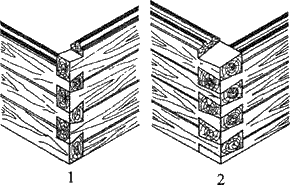 Рис. 67. Однослойная бревенчатая стена с конструкцией вязки вкрест: 1 – из бревен круглого сечения, с круглыми заглублениями; 2 – из бревен квадратного сечения, с профильным сопряжением.