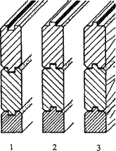 Рис. 65. Конструкция канавочных шипов бревенчатой стены и направления ориентировки элементов: 1 – неправильно; 2 – затруднительное сплачивание (пазование) канавочных шипов; 3 – правильно.
