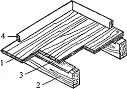 Рис. 27. Цокольное перекрытие по балкам: 1 – доска пола; 2 – балка; 3 – рубероид; 4 – плинтус.