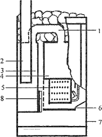 Рис. 49. Печь-каменка фирмы «Васта»: 1 – перепускной газоход; 2 —дымоход; 3 – задняя секция; 4 – камера сгорания; 5 – горелка; 6 – внутренний корпус; 7 – внешний корпус; 8 – прочистка.