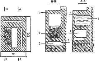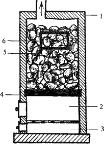1 – кирпичный корпус печи в металлическом уголке; 2 – топливник; 3 – зольник; 4 – колосники; 5 – каменная засыпка; 6 —дверь для выхода пара.