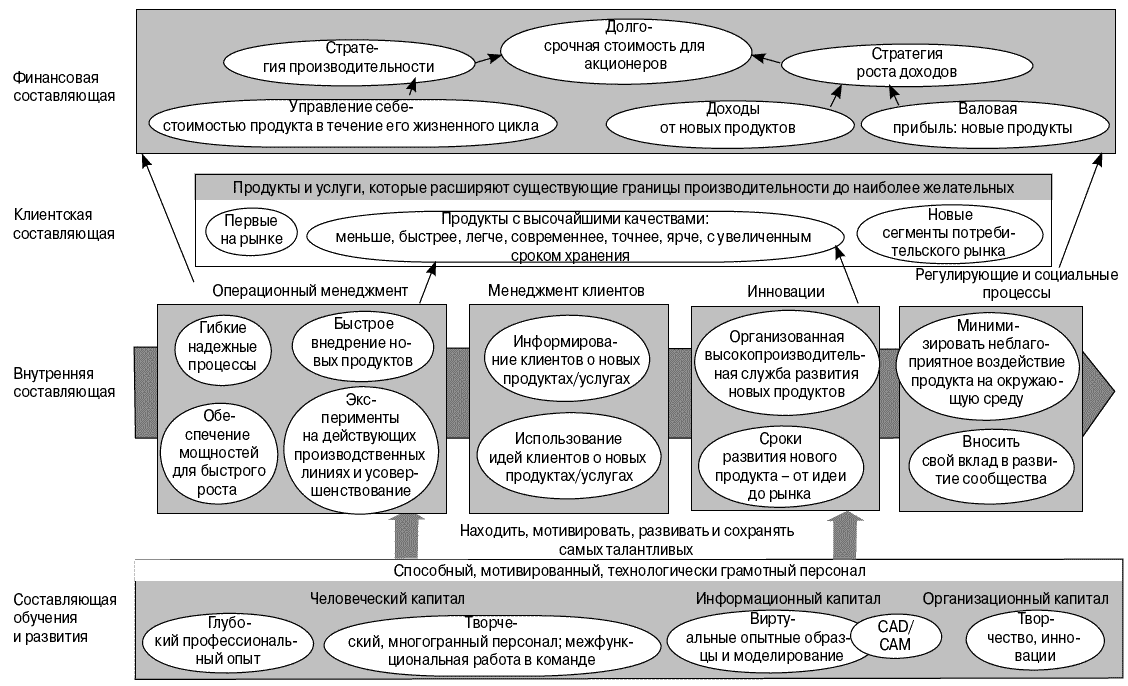 Внутренняя составляющая. Для достижения целей клиентской составляющей компания должна иметь соответствующую цепочку создания ценности, т. е. совокупность внутренних бизнес-процессов, способных создавать нужную ценность предложения. Эти процессы называются стратегическими, а их способность создавать ценность задается целями внутренней составляющей.