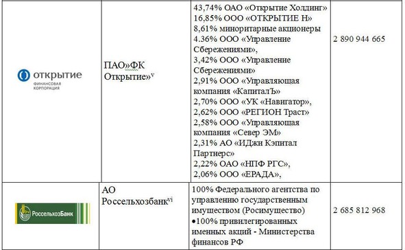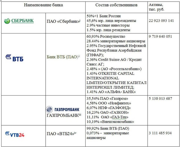 Из этой таблицы можно сделать несколько очень любопытных выводов, во-первых, в настоящий момент у нас, практически, не осталось государственных банков. Самый крупный банк страны – Сбербанк – практически на половину принадлежит иностранным инвесторам, а вторая половина принадлежит Банку России. Необходимо подчеркнуть, именно Банку России, а не государству, как многие считают. Правовой статус и функции Центрального банка Российской Федерации определены в статье 75 Конституции Российской Федерации. Статус, цели деятельности, функции и полномочия Банка России определяются Федеральным законом от 10 июля 2002 года №86-ФЗ «О Центральном банке Российской Федерации (Банке России)» и другими федеральными законами. То есть, Центральный Банк России – это как бы независимый от государства орган. И как справедливо отмечают многие критики, деятельность центрального банка во многом определяется обстановкой на международных финансовых рынках, иногда и в разрез с интересами простых граждан России: вспомним обвал национальной валюты в 2014 году. Девальвация российской валюты (резкое падение курса рубля) в 2014 – 2016 году нельзя отнести к достижениям нашего главного банка страны. Хотя существует и другая точка зрения, в соответствии с которой наш центральный банк сделал все правильно – и национальную валюту обесценил в условиях мирового кризиса, и ставки резко поднял вовремя. Все зависит от того каких взглядов на экономику придерживаться. Во-вторых: из десятка крупных банков, только два банка, на прямую подконтрольны государству через Федерального агентство по управлению государственным имуществом (Росимущество). Это на 100% АО «Россельхобанк» и на 60% Банк ВТБ (ПАО). Еще можно говорить о косвенном владении государством банка ВТБ24, которым на 99,9% владеет Банк ВТБ (ПАО). И в третьих, очень интересный вывод можно сделать, если посмотреть структуру активов банков из первой десятки – в настоящее время в банках все же хранится достаточно много денежных средств граждан, причем большая часть – около 10 триллионов рублей, по прежнему хранится в Сбербанке. В этом банке, почти в 5 раз больше денег в вкладах, чем в ближайшем по объемах привлечению денежных средств граждан – ВТБ24.5 Ситуация прямо сказать парадоксальная, большую часть денег население хранит в «иностранном банке» – на 46% собственниками которого являются не граждане нашей страны. И этот парадокс объясняется прежде всего в силу сложившихся исторических традиций, что Сбербанк, по мнению старшего поколения, единственный «государственный» банк в стране, а также из за не знания истинного положения вещей многими гражданами России.