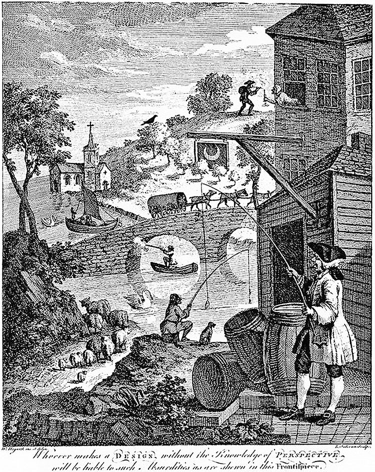 Рис. 2. Уильям Хогарт. Сатира на неверную перспективу (1754). «Всякий, кто создает рисунок без знания перспективы, рискует впасть в такие же нелепости, какие показаны на этом фронтисписе»