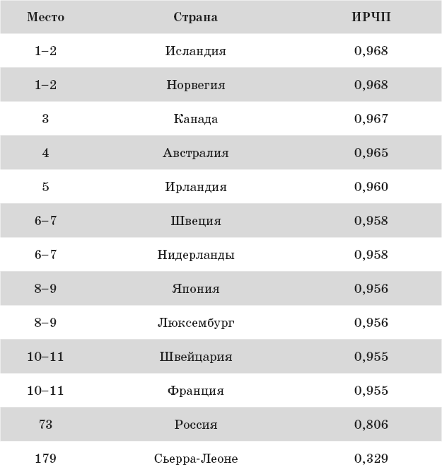 Для оценки развития социальной сферы в различных странах ООН использует индекс развития человеческого потенциала (ИРЧП), который учитывает среднюю продолжительность жизни, уровень образования населения и реальный душевой валовой внутренний продукт. Страна, в которой средняя продолжительность жизни составляет 85 лет, валовой внутренний продукт (ВВП) на душу населения – 40 тыс. долл. и 100 % взрослого населения грамотно, имеет ИРЧП, равный 1. ИРЧП, равный 0, имеет страна, где средняя продолжительность жизни – 25 лет, ВВП на душу населения – 100 долл., 100 % взрослого населения безграмотно и дети не получают никакого образования. В табл. 2.1 приводятся значения ИРЧП в ряде стран, представленные в отчете ООН 2008 г.