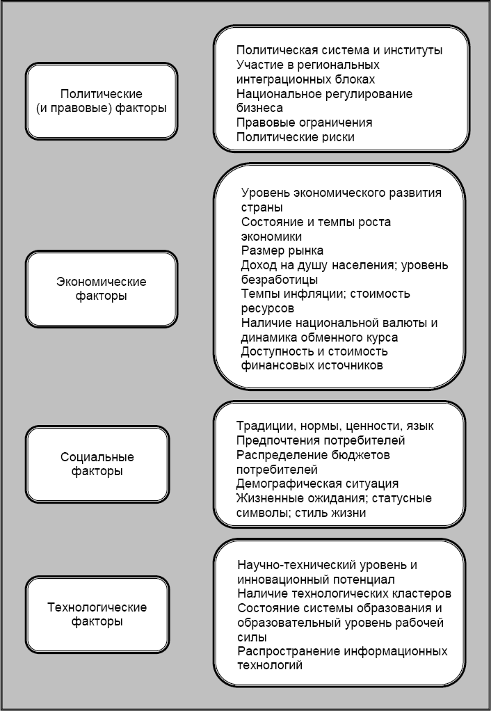 Менеджеры компаний обычно не могут изменять характеристики макросреды, но они должны обязательно принимать их во внимание при определении направлений зарубежной экспансии. Изучение страны, где компания ведет (или намеревается вести) свой бизнес, может начинаться со знакомства с базовыми сведениями из истории, географии и культуры этой страны. Дальнейшие шаги связаны с детальным изучением тех отличительных характеристик страны, которые максимальным образом влияют на условия ведения в ней деловых операций.
