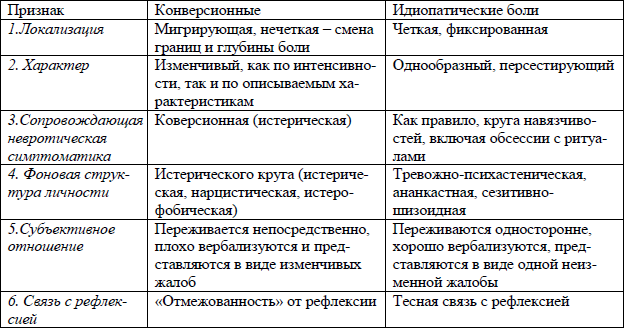 Таблица 1. – Феноменологические характеристики двух типов соматоформных болей