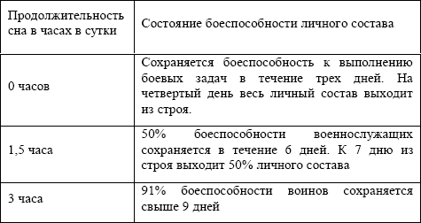 Американские специалисты специально изучали зависимость боеспособности личного состава от продолжительности сна. Результаты исследования представлены в табл. 1.