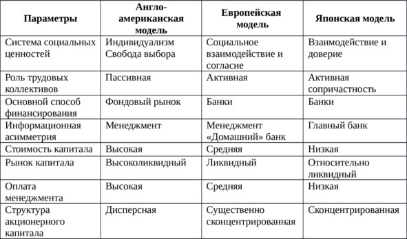 Выделяют три базовые модели корпоративного управления: англо-американскую, японскую и европейскую (германскую). Сравнительная характеристика данных моделей представлена в таблице 1.1. В основе российской модели экономического развития лежит англо-американская модель корпоративного управления.