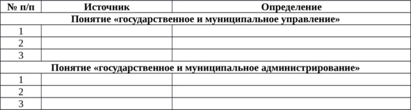 1. Используя источники современной учебно-научной литературы подберите не менее трех определений понятиям «государственное и муниципальное управление» и «государственное и муниципальное администрирование», материал представьте в виде таблицы СР 1.1.