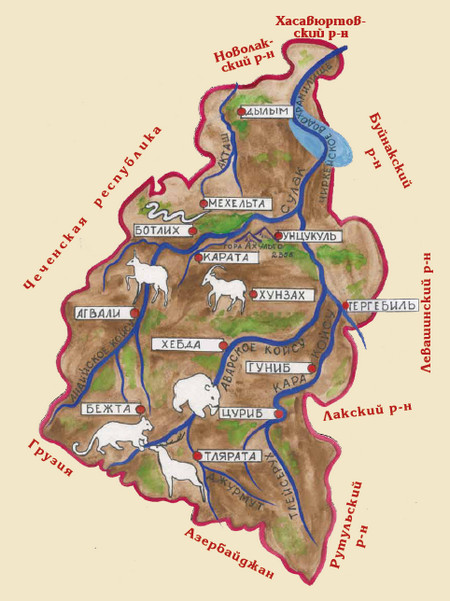 Реки: Аварское Койсу, Андийское Койсу, Сулак. Горы: Аддала-Шухгельмеэр 4151, Диклосмта 4285, Шавиклде 3578.