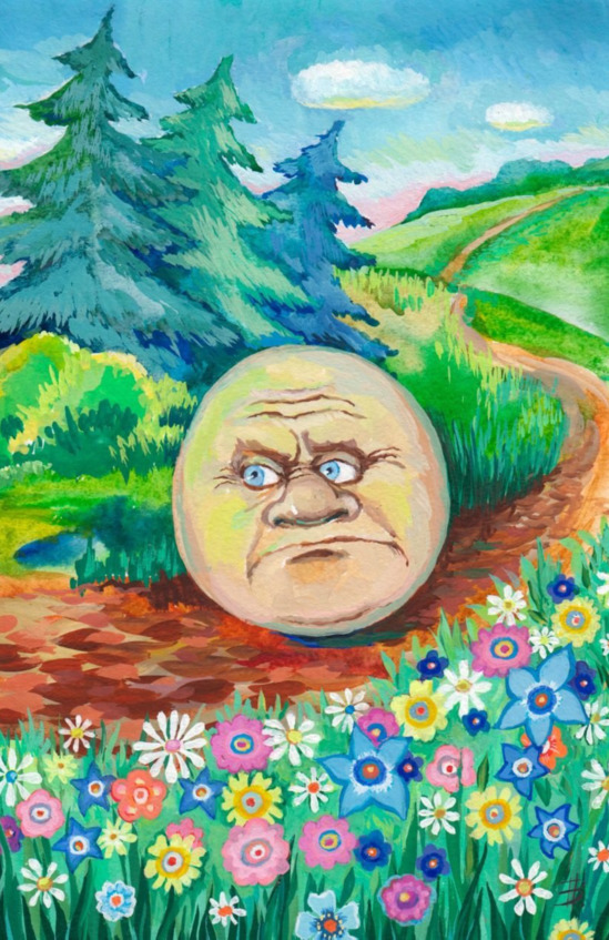 Жил-был человек. Без туловища. Без ног и рук. Без сердца и души. Но голова была. Ну, уж очень большая голова. Его звали Колобок. Колобок никого не любил. Катался он с места на место по всему свету и злился на всех и вся, и всё искал собственную справедливость. Всем завидовал, со всеми ругался и на всех обижался. Вот так и жил. Без любви, потому что он был бездушный. Злобствовал он, злобствовал до тех пор, пока злоба чёрная-пречёрная не съела его.