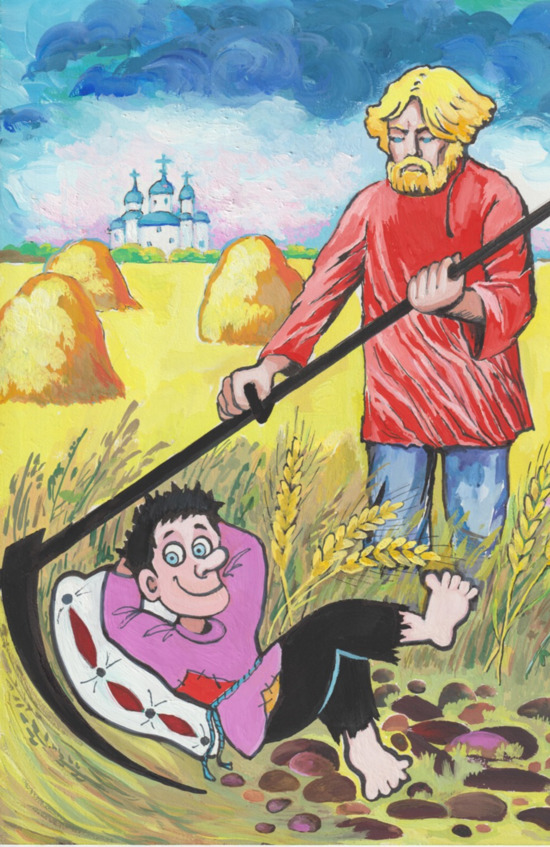 За деревней поля. Одно поле, наполненное золотыми колосьями и благодатным урожаем, принадлежит трудолюбцу, который трудится не покладая рук и чтит день субботний. А вот у его соседа, который лентяй и лежебока, и который не чтит субботний день, все поле поросло сорняком. Тогда труженик предложил лежебоке продать ему его поле. Лентяй с радостью согласился и за бесценок продал труженику свои наделы. Деньги скоро промотал, а сам чуть с голоду не помер. Тогда труженик взял его в батраки. И лентяй стал батраком, работал у труженика за кров над головой и миску похлёбки. А если бы он чтил день субботний и трудился, то жил бы не хуже труженика.