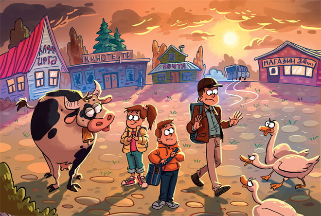 Пассажиры выбрались из маршрутки, и та умчалась прочь, обдав их напоследок густым облаком пыли. Князевы огляделись по сторонам. Они стояли на маленькой круглой площади, обрамлённой старинными двухэтажными зданиями. Прямо перед остановкой располагались продуктовый магазин, небольшой кинотеатр и почтовое отделение. По площади лениво бродили коровы и гуси.
