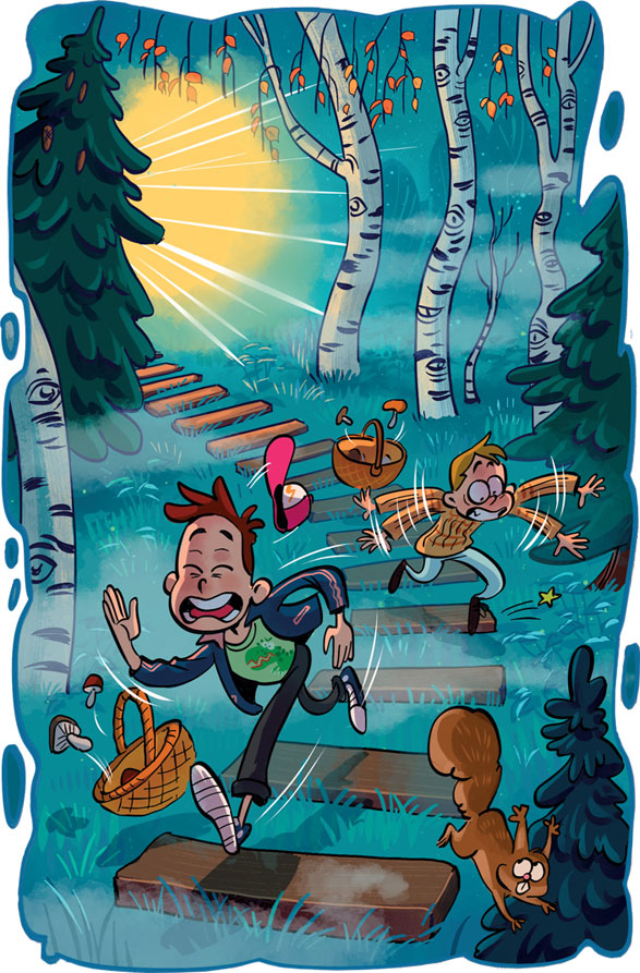 Только такого быть не может. Узкоколейка местами разобрана давно, ни один поезд по ней сейчас не проедет. А он из тумана как вылетит! Шум, грохот, свист! Мы от яркого света едва не ослепли! Попа́дали в траву, все собранные грибы рассыпали. А поезд пронёсся мимо нас и исчез, будто его и не было!