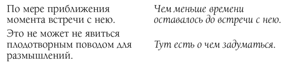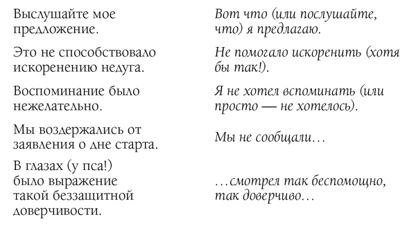 Громоздкими канцелярскими оборотами жечь сердца, затронуть душу довольно трудно. Обилие существительных, особенно отглагольных, тяжелит и сушит речь. Фраза со многими косвенными падежами неуклюжа и недоходчива. Причастия и деепричастия, слова вроде вращающиеся, находившиеся, выращиваемые тоже не делают прозу благозвучной, ясной и никого не взволнуют. Во всем этом нетрудно убедиться. К примеру, авария на корабле, люди на краю гибели – и вот как в двух вариантах рассказано о капитане: