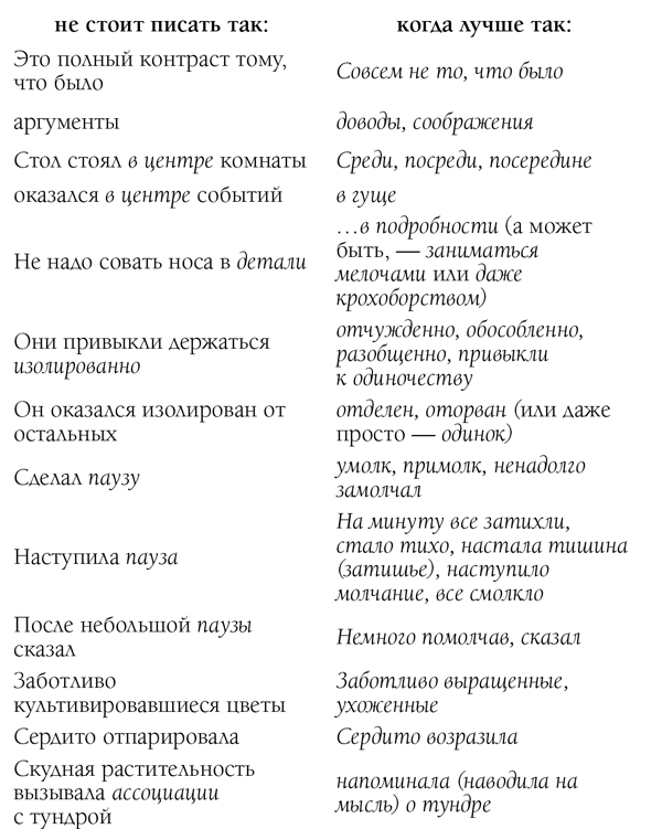 Получается нелепо и обидно: десятки, если не сотни совершенно разных книг, написанных разными людьми, на разных языках, в разное время, в совершенно несхожей манере и на самые разные темы, становятся неотличимо похожи друг на друга: тот же стертый, однообразный неживой язык, те же казенные слова-штампы. Слова эти въедаются, как репьи, даже в добротную ткань хороших переводов – и не только переводов, но и оригинальной прозы. К ним привыкли, их вовсе не считают лишними не только неумелые и неопытные литераторы.
