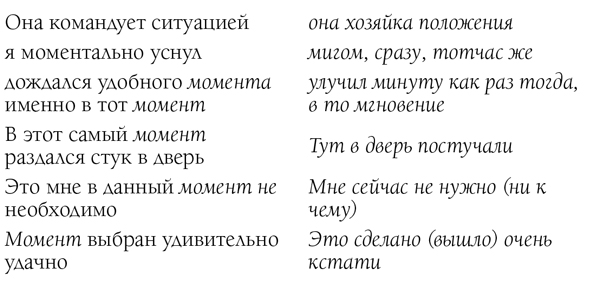 Мы давно забыли, что и секунда, минута тоже слова западноевропейского происхождения: они стали у нас своими, обыденными. В моменте же и сейчас есть призвук официальности, газетности: данный, текущий сочетается с ним привычнее, чем роковой. Пушкин покинул своего героя «в минуту злую для него». А многие наши писатели всюду, где, смотря по смыслу и настроению, можно и нужно сказать время, минута, секунда, миг, час, мгновенье, тотчас же, с той поры, отныне, до тех пор, обходятся одним и тем же способом.