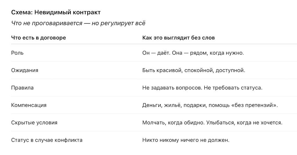 Он платит. Она рядом. Есть определённые правила: когда говорить, когда молчать, когда исчезнуть. Есть признание – не публичное, но стабильное. Есть помощь, если нужно. Есть границы, которые нельзя пересекать – даже если формально вы друг другу никто.