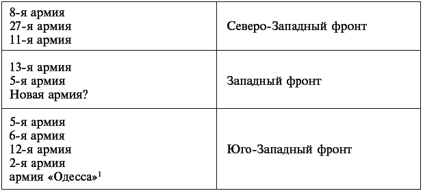{1} В июне – июле 1941 г. на западных фронтах РККА имела следующую структуру: Северо-Западный фронт (командующий – генерал-полковник Ф.И. Кузнецов) в составе 8, 11 и 27-й армий, Северный фронт (генерал-лейтенант М.М. Попов) – 14, 7 и 23 армии; Западный фронт (маршал С.К. Тимошенко) – 3, 10, 4-я армии и нескольких механизированных корпусов; Юго-Западный фронт (генерал-полковник М.П. Кирпонос) – 5, 6, 26, 12-я армии; Южный фронт (генерал армии И.В. Тюленин) – 18 и 9-я армии. Одессу обороняла Приморская армия генерал-лейтенанта Г.П. Софронова. На рубеже среднего течения рек Западная Двина и Днепр развертывалась группа армий резерва Ставки ГК (19, 20, 21 и 22-я армии). 10.7.1941 были назначены главкомы стратегических направлений: маршал К.Е. Ворошилов – Северо-Западного (Северный и Северо-Западный фронты, Северный и Балтийский флоты), маршал С.К. Тимошенко – Западного (Западный, Центральный – с 24 июля и Резервный – с 30 июля фронты), маршал С.М. Буденный – Юго-Западного (Юго-Западный и Южный фронты и Черноморский флот). – Прим. ред.