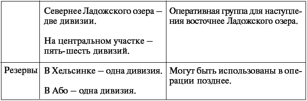 V финский корпус в составе двух дивизий предназначается для операций против Кандалакши. Аландские острова должны быть заняты одним пехотным полком, который финны усилят сверх установленного штата. Для захвата полуострова Ханко предусмотрена одна дивизия. На Ленинградском направлении развертываются четыре дивизии.