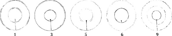 — El señalamiento de si las leyendas insertas en una segunda orla son por completo anilladas o no, porque, aunque lógicamente toman forma circular, no es raro ver huecos o adornos de cierre. Sería ocioso indicarlo en la inscripción principal, siempre perfectamente abrochada, salvo un pequeño hueco al final de la copia 60.