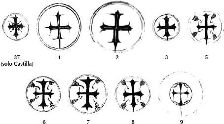 Radica en los originales 1 (sospechoso),13 2, 3, 5, 8 y 9 del escribano Gonzalo Martínez y las copias 6 y 7 del siglo xviii que reproducen el número 5. Oscilan entre 52 y 75 mm Ø, son de orla única, que supone entre el 44 y el 56 % Ø (39 % en 9, que incorpora una fimbria), y mantienen la típica leyenda exterior castellana con las confirmaciones de mayordomo y alférez.