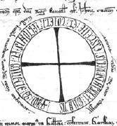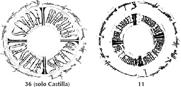 — Invierte la colocación habitual: sentido horario por apoyar el renglón hacia dentro, e inicio arriba. Así irá viéndose a partir de 1242 y se impondrá bajo Alfonso X; por tanto, era lo normal en época de Alfonso XI, cuando se hizo esta copia.