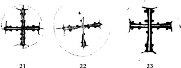 No hay otra diferencia apreciable entre las cruces de Pascasio de Soria y Pablo Sánchez salvo que las del segundo apenas abocinan los brazos, mientras que las del primero son claramente patadas; de ahí la atribución a Pablo del deteriorado 22. El facsímil 23 la hace latina y prescinde de adornos extremos y del asta.31