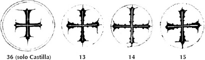 Las cruces son muy peculiares: ocupan casi todo el campo, patadas, de potenzas alabeadas, con otra inscrita vaciada, dos abultamientos a cada lado de los brazos y bodoques extremos con un rabillo que puede alcanzar la gráfila, y están apoyadas sobre simplísima asta. La de 1229 era más sencilla: sin cabillos ni lóbulos braquiales, y descansa en un cuadradito sobre un triángulo invertido que no llega hasta la gráfila.