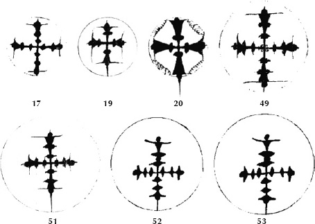 — Patadas que agotan el campo (24, 25, 31, 37, 40, 43, 59 y 60); 27 y la copia 48 acortan algo los brazos y los dotan de largas potenzas rectas que tocan la gráfila.