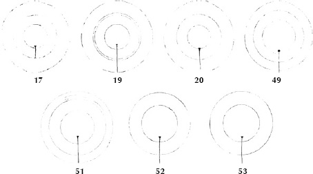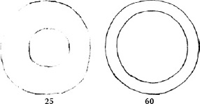 Miden entre 68 y 69 mm Ø, y las dos orlas tienen pareja anchura en los originales (32-29 y 30-31 % Ø), mientras que la exterior se dilata en la copia (20-28 %). Las gráfilas son sencillas, muy finas las de 22 y 23.