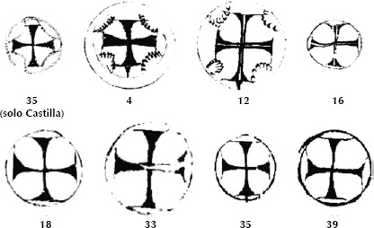 Las cruces son patadas y de potenzas rectas que se prolongan hasta rozar la gráfila interior, abarcando, pues, la mayor parte del campo, a cuyo tamaño se amoldan (13 a 24 mm Ø). La ornamentación escasea: otra cruz blanca inscrita en 12 y 16, y festón de cuatro arcos polilobulados junto a la gráfila en 4 y 12. Estas dos apoyan sobre un triángulo invertido, y 35 sobre breve asta que invade la orla.