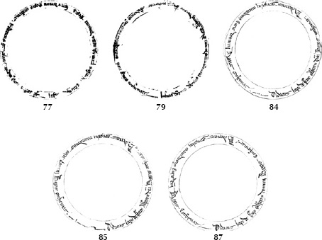 A pesar de ser anular la leyenda externa, y contra la costumbre tradicional en atención al rango, hay indicios de haberse redactado antes la confirmación del alférez, pues arranca siempre en el punto superior o inferior; la del mayordomo cae con frecuencia hacia la mitad de un cuadrante, y tras el confirmat de este —no tras el del alférez—, además de la interpunción, suele rasguear para cerrar el anillo (77, copia 79, 84, 85 y 87); se exceptúa 96, donde un amplio hueco tras el alférez denota haberse escrito al final. No obstante, en todos los casos el mayordomo seguirá yendo en el flanco izquierdo, opuesto al alférez; tal vez esté ello relacionado con que las primeras ruedas coinciden con el alferazgo del infante Alfonso [X]. Pero en 78 y 80 (M-XXVII), bajo igual escenario, las características gráficas de la leyenda no permiten asegurar la alteración en el orden de escritura.114 No obstante, vuelto Diego López de Haro al cargo, la circunstancia se mantuvo temporalmente sin que coadyuvara a retomar la vieja costumbre ni siquiera la vacante en la mayordomía de 92 y 93: maiordomatus curie rregis vacat.