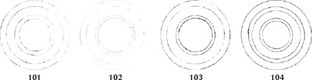 El original tiene 63 mm Ø, y las copias entre 79 y 94 mm. En todo hay dos orlas, la principal de entre el 21 y el 26 % Ø, y la secundaria del 17 al 21 %. Ninguna elude una fimbria al borde del campo (7-13 %), y el original suma otra entre ambas coronas (11 %). Las gráfilas son sencillas, y en 104 la que bordea por dentro la segunda orla adolece de pequeños desajustes, como por haberse terminado de cerrar a mano alzada.