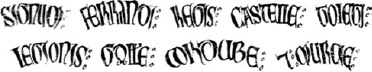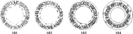 El acoplamiento de la leyenda principal debía de ser distinto en cada original, pues las tres copias del extraviado siguen la pauta normal (base externa contrahoraria y arranque abajo), mientras que en 104, aun naciendo asimismo en la parte inferior, pisa adentro y se vuelve por ello de sentido horario, lo cual hubo de repercutir en el diseño general, pues, igual que Sancho de Segovia (M-XXV),124 Juan Domínguez de Segovia saca los braquigráficos fuera de la orla: 101, 102 y 103 los colocan en la acostumbrada fimbria que bordea el campo, pero el contrasentido de 104 ocasionó una nueva fimbria entre las coronas para no interferir en la confirmativa.