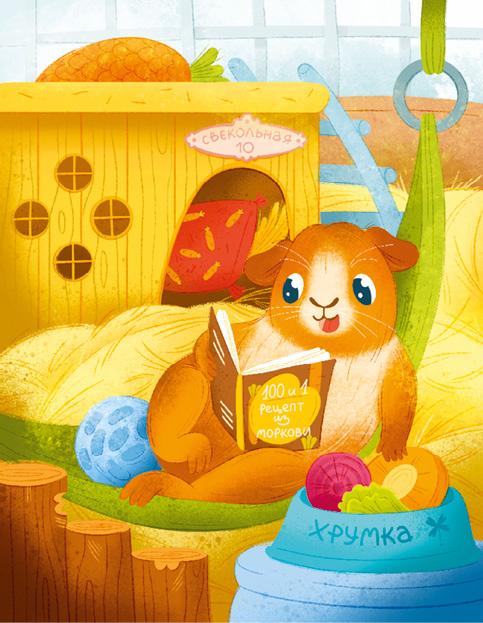 Хороша была жизнь Хрумки – водились в его мисочке всегда и морковь, и свёкла, над домиком висел гамак, а в домике ждала уютная перинка из сена. Жил Хрумка не тужил: то в гамаке покачается, то кругами по клетке побегает, то кулинарную книгу полистает – как получше морковку заготавливать. И был Хрумка пушистый, круглый, оранжево-рыжий, даже золотистый – ну точь-в-точь апельсин.
