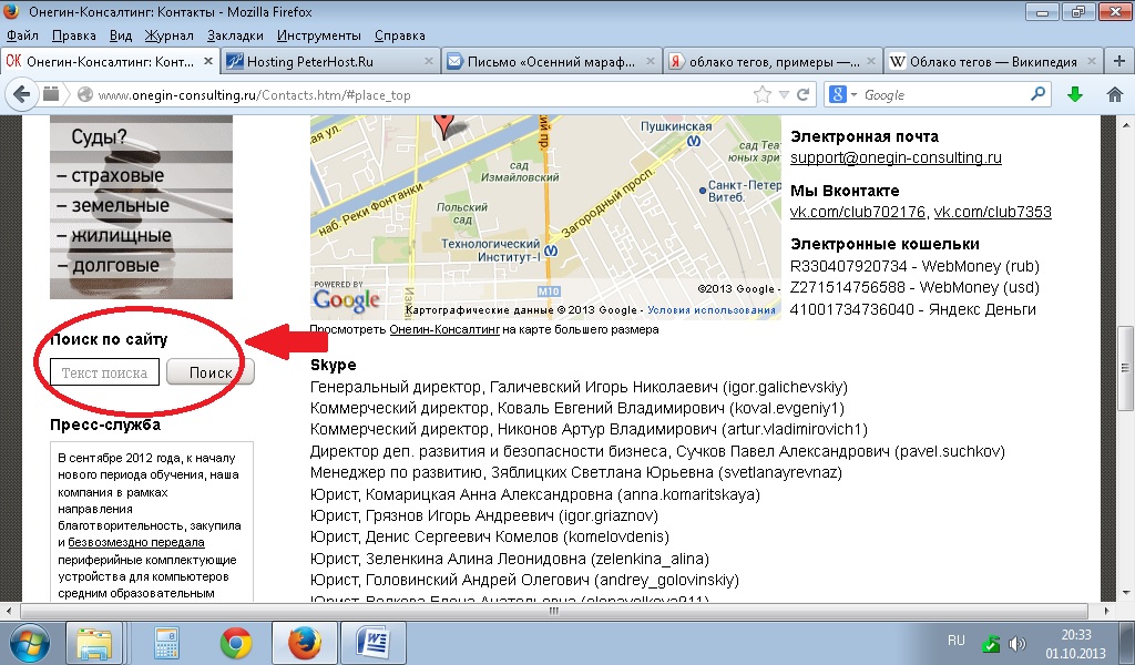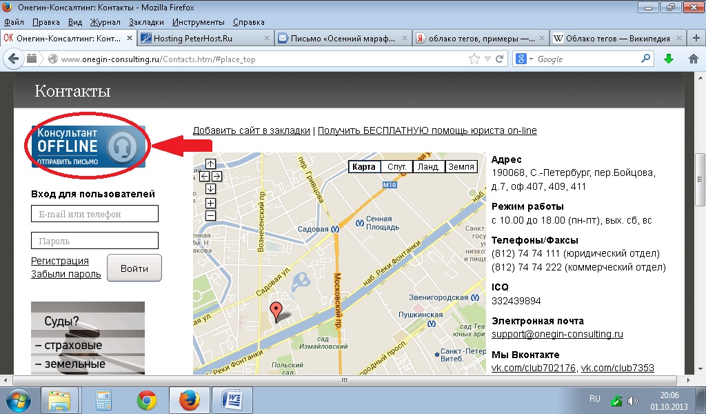 Онлайн-консультант (номер ICQ/Skype) (рис. 11). Здесь уже речь идет о возможности обработать запрос в режиме реального времени, т.е. непосредственно общаясь с пользователем с помощью интернета. Зачастую это оказывается гораздо эффективнее, чем те запросы, которые поступают и ждут своего часа для рассмотрения. Стрелкой на рисунке показан внешний вид одной из таких форм «онлайн-консультанта», внедренной на сайте моей организации. Я заплатил за нее единожды и сравнительно небольшую сумму в пределах 10.000 рублей, а моя коммерческая служба использует эту форму уже несколько лет и даже периодически вытаскивает оттуда контракты. К тому же, если внимательно рассмотреть рисунок, то видно, что там также указан и номер ICQ, по которому можно связаться с представителем компании. Более того, если продолжать разговор о моей фирме, то в разделе «Контакты» есть также и номера скайпов некоторых сотрудников, правда, используются они, в основном, для того, чтобы сотрудники перебрасывали друг другу фрагменты информации или общались по видеосвязи c другими регионами РФ.